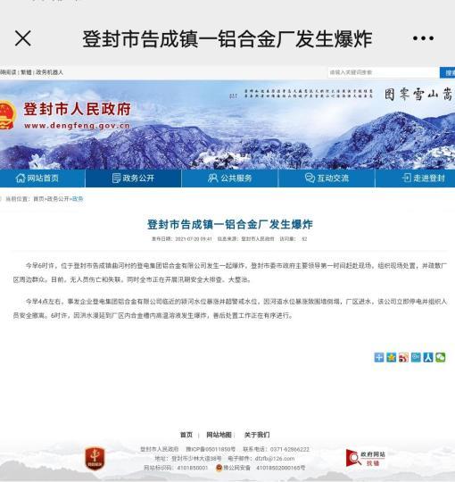 据登封市政府官方通报,今早6时许,位于告成镇曲河村的登电集团铝合金有限公司发生一起爆炸,登封市委市政府主要领导第一时间赶赴现场,组织处置,并疏散厂区周边群众。目前,无人员伤亡和失联。