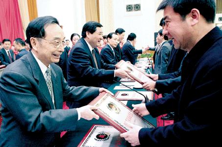 12月21日,在国家免检产品颁证大会现场,全国人大常委会副委员长蒋正华(左一)、国家质检总局党组书记李传卿(左二)等领导正在为获证企业代表颁发证书。 蒋正华李传卿葛志荣蒲长城郭汝斌孙大伟刘平均宋明昌出席并为企业颁证
